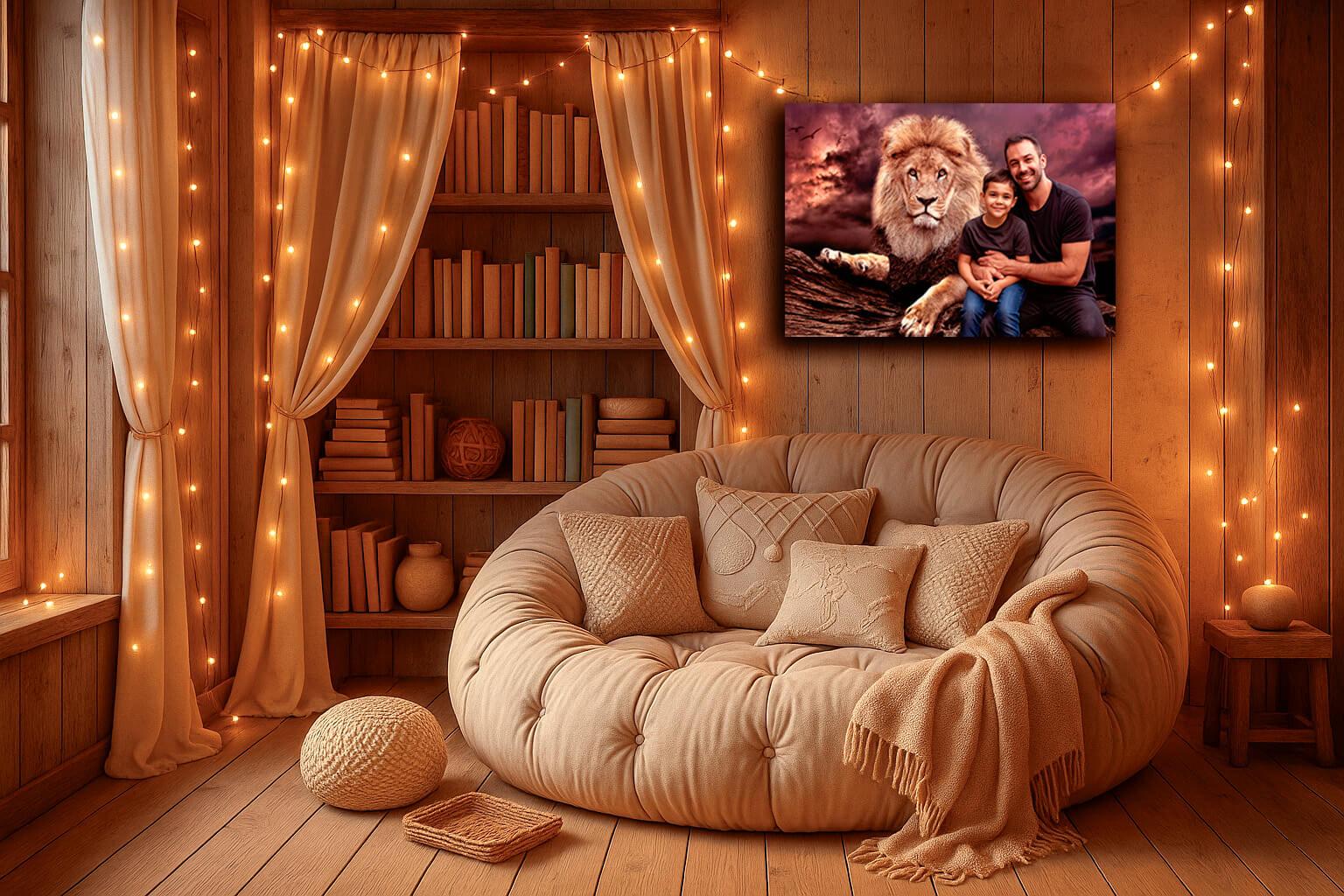Affirmez votre force et votre courage avec un portrait personnalisé devant un lion majestueux. Création artistique unique réalisée par un graphiste professionnel. Cadeau puissant et inspirant, création rapide, livraison gratuite.